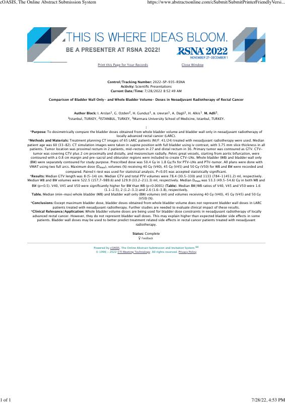 Arslan I., Özden G., Gündüz H. K., Devran B. Z., Dağlı A., Alkiş H., Adli M., \"Neoadjuvan radyoterapi uygulanan rektum kanseri hastalarında mesane duvarı ve volümü dozlarının karşılaştırılması\", 108th Scientific Assembly and Annual Meeting of the Radiological Society of North America, Illinois, Amerika Birleşik Devletleri, 27 Kasım - 01 Aralık 2022